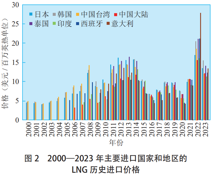 根據標(biāo)普全球數據,2000—2004年日本、韓國的(de)LNG進口價格基本(běn)維持在5美元/百萬英熱單位;到2008年,日本、韓國和中國台灣的LNG進口價格(gé)上漲至12~15美元/百萬(wàn)英熱(rè)單位的階段性高點;隨後短期回落至5~10美元/百萬英熱單(dān)位,並(bìng)在(zài)2011—2014年再次衝高至10~15美元/百萬英熱單位;2015—2021年主要進口國家(jiā)和地區的LNG價格繼續在5~10美元/百萬英熱單(dān)位震蕩;2022年(nián)受俄烏衝突等(děng)因素影響,主要進口國家和地區的進口LNG價(jià)格均創曆史新高;2023年主要進口國家和(hé)地區的LNG進口價格(gé)回落至(zhì)10~15美元/百萬英熱單位(見圖2)。