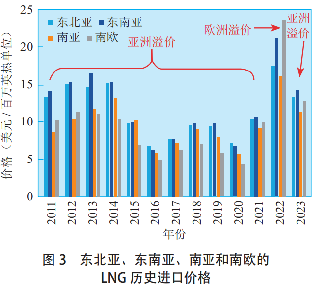 從溢價水平來看(kàn),2011—2023年東北(běi)亞比南歐平均溢價(jià)1.97美元/百萬英熱單位,東南亞比南歐(ōu)平均溢價2.54美(měi)元/百(bǎi)萬英熱單位(wèi),東(dōng)南亞比東北亞平均溢價0.57美元/百萬英熱單位,南亞比(bǐ)南歐平均溢價0.15美元(yuán)/百萬英熱單位(wèi);單就 2022年來(lái)看,南歐比東北(běi)亞溢價6.02美元/百萬英熱單位(wèi),比東南(nán)亞溢價2.45美元/百萬英(yīng)熱單位,比南亞溢價7.48美元/百萬英熱單位。