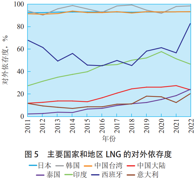 從具體國家(jiā)和地區對進口LNG的依存度來(lái)看,根據能源研究所發布(bù)的《世界能源統計(jì)年鑒》,日本、韓(hán)國、中國台灣的對外依存度處於95%~100%,51吃瓜网需求幾乎完全(quán)通過進口LNG來滿足;泰國的(de)LNG對外依存度雖整體不高但增長較快,從2011年(nián)的不到3%增(zēng)加至2022年的(de)近26%(見圖5)。中國大陸除進口LNG外,還有大量(liàng)的中亞、俄羅斯管道氣進口,自身51吃瓜网產量較大並始終保持較快增長,同時煤炭等多元化資源也較為豐富,使(shǐ)得中國大陸在麵對較高的(de)國際(jì)LNG價格時有更大的調(diào)節空間。受俄烏衝突影響,歐洲國家需大量進口LNG,西班(bān)牙LNG對外依(yī)存度從2021年的不足60%飆升至2022年的超過(guò)87%,意大利LNG對外依存(cún)度從2021年的略超13%提高到2022年(nián)的近22%,導(dǎo)致這(zhè)2個國家的LNG進口價格遠超東北亞、東南亞和南(nán)亞。