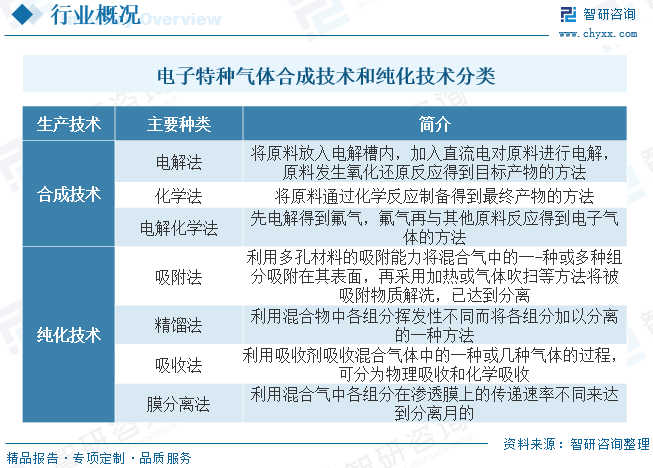 電(diàn)子特氣有純(chún)度和混配精度兩個核心指標,通過氣體純(chún)化和氣體合成兩項生產技術來滿足要求。根據氣體的特征不同,純化與合成技術又有多種不同種類的製作方法。常見的氣體純化技術主(zhǔ)要有吸附法、精餾法、吸收法、膜分離法等,氣體合成技術主要分為電解法、化學法和電(diàn)解化學法等。