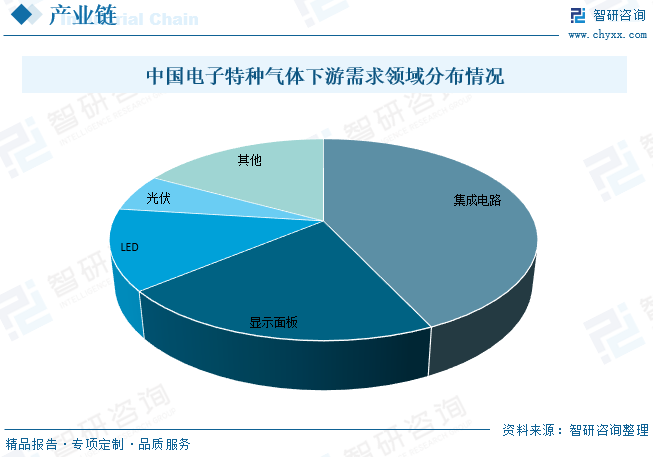 從產業鏈來(lái)看,上遊,氣體原料(liào)和化工原料是電子特氣(qì)的(de)主要生產原料;氣體設備(bèi)是電子特(tè)氣的重(chóng)要生產(chǎn)設備,另外,由於氣體產品大多數為危險化學品,因此運(yùn)輸環節鋼瓶需求也必不可少。電子特氣下遊應用主要為集(jí)成電路,液晶麵板和太陽能(néng)電池製造等行業(yè)。