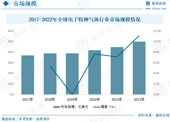 在集成電路以及(jí)相(xiàng)關下遊行業需求增(zēng)長的帶動下,全球電子特種氣體市(shì)場規模呈(chéng)現逐年穩步增長態勢(shì)。據統計,2022年全球電子特種氣體行(háng)業市場(chǎng)規模約為50.0億美元,同比增長(zhǎng)11.1%。
