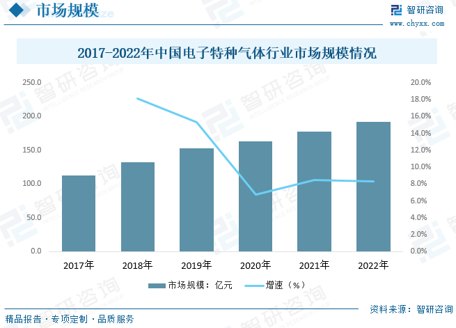 中國(guó)特種氣體行業發展迅速,其中63%約為電子特種(zhǒng)氣體,下遊應用主要集中在電子半導體領域,電子特氣市場前景廣闊。據統計,2022年中國電子特種(zhǒng)氣體行業市場約為192.2億(yì)元,同(tóng)比增長8.3%。