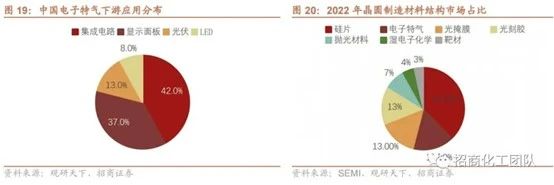 電子特氣主要應用於半導體領域,消費量(liàng)占(zhàn)比約7成。電子特種(zhǒng)氣體,簡稱電子特氣、Electronic Specialty Gases、ESG,是特種(zhǒng)氣體(tǐ)的重(chóng)要分支,具有高技術、高附加值的特點,是半導體、液晶顯示麵板、光伏、LED等電子工業生產中必不可(kě)少的基(jī)礎和支撐性原材料(liào),被廣泛應用(yòng)於清洗(xǐ)、光刻、刻蝕、摻雜、外延(yán)沉積等工藝中。根據觀研天下,集(jí)成電路所消費的電子特氣占全部電(diàn)子特氣的42%,顯示麵板為37%,光伏為13%,LED為8%。
