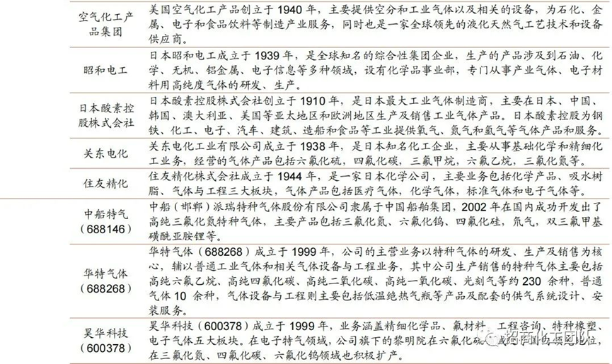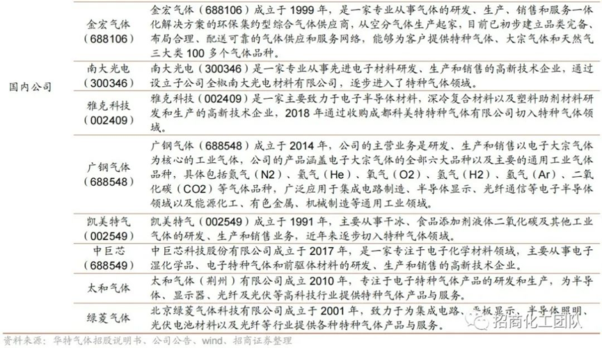 公(gōng)司是中國特種氣體國產化的先行者,率先打破極大規模集成電路、新型顯示麵板等高端領域氣體材料製約(yuē)的民族氣體廠商。公司(sī)主營業務為特種氣體、普通工業氣體和相關氣體設備與工程業務,其中特氣(qì)業務為主要收入和利潤來源,約占公司總(zǒng)收入的7-8成。公司特種氣體主要麵向集成電路、顯示麵板、光伏新能源、光纖光纜等新興產業,公司在上述領域(yù)實現了包括高純四氟化碳、高純六氟乙烷、光刻氣、高純二氧化碳、高純一(yī)氧(yǎng)化碳、高純氨(ān)、高純一氧化氮等眾多產品的進口替代。公司特氣質量國內領先,是國(guó)內唯一一家同時通過ASML和(hé)GIGAPHOTONR認證的公司,公(gōng)司對8寸、12寸集成電路廠商的覆蓋率超90%,解決了長江存儲、中芯(xīn)國際(jì)、華虹(hóng)宏力、 華潤微(wēi)電子、台積電(中國(guó))等客戶多種氣體(tǐ)材料的進口製約,並進(jìn)入了英(yīng)特爾、美光科技、德州儀器、台積電(diàn)、SK海力士、英飛淩、三星、鎧(kǎi)俠等(děng)全球領先的(de)半導體企業供應鏈體係。
