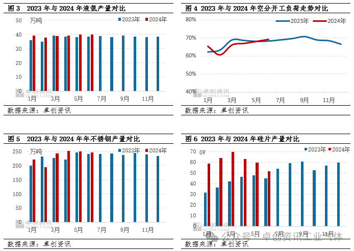 供(gòng)應方麵,二季度來(lái)看(kàn),空分裝置多正常運行(háng),且開工負荷率保持相對高(gāo)位態勢。據卓創資訊數據監測,二季度空分開(kāi)工負荷(hé)平均在67.98%,環(huán)比提升(shēng)3.5個百分點,受其帶動疊加液(yè)氬產能釋放(fàng)支撐,二季度液氬(yà)產量在118.8萬噸,環比增加3.3萬噸,供應增長對液氬市場(chǎng)表現利空。需求方麵,二季度不鏽鋼產量呈下滑走勢,對液氬需求維持(chí)剛需,難以支(zhī)撐(chēng)液(yè)氬市場;矽片方麵,受下遊裝機需求疲軟影響,矽片去庫存速度緩慢,企業低(dī)負荷(hé)運行,導致二季度(dù)矽片產量持續下滑。據數據統計,二季度矽片產量173.96GW,環比下降9.59%,用氬需求縮量明顯。綜合來看,供應增加(jiā)、需求減弱導(dǎo)致二季度(dù)液氬價格跌跌(diē)不休。