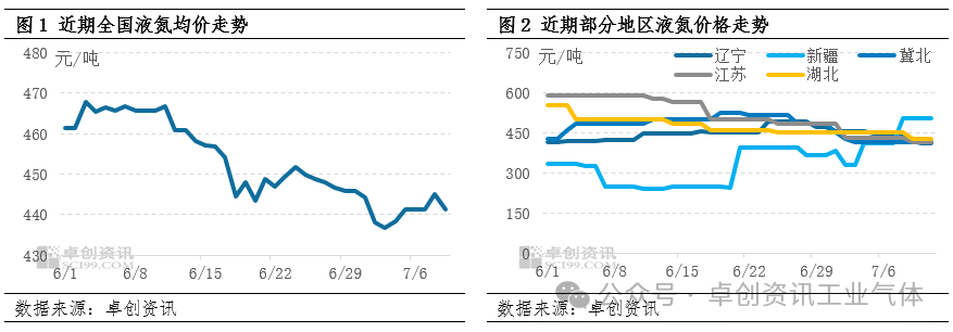 6月份以(yǐ)來(lái),空分開工負荷高位震蕩,液氮市場整體供應較足,需求表(biǎo)現清淡,僅西北局部交投尚可,全國均價呈震蕩下跌走勢(shì)。據卓創資訊數據監測,截至7月11日(rì),全國液氮均(jun1)價至436.52元/噸,較上月同期跌6%,較去年同期跌21%。