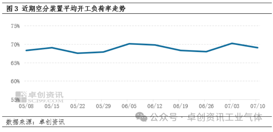 6月份以來,全國空分裝置平均開工負荷率震蕩調整,液氮市場整(zhěng)體供應(yīng)充足,僅寧夏、新疆等個別地區主力企業檢修較多,當地資源(yuán)收緊對價格小有支撐。據卓創資訊數據監測,截至7月11日,全國空分裝置平均開工負荷率至70.28%,較上(shàng)月同期上升0.48個百分點。需(xū)求麵,西北(běi)地區煤化工行業用量尚(shàng)可,對區域氛圍產生提振;其他區域則表現清(qīng)淡,下遊采(cǎi)購維持剛需,對市場缺乏指引。綜合來看,近期液氮市場供需矛盾加劇,基本麵對市場支撐有限。