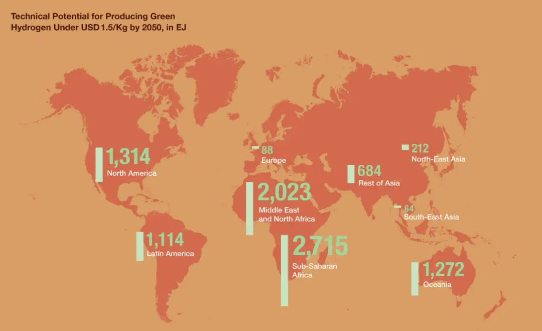 埃及834.5億美元,阿曼554.1億美元,摩洛哥168.5億美元、沙特阿拉伯(bó)130億美(měi)元、阿(ā)聯酋120.8億美元……這(zhè)些數字不是別的,是中東北非五國要在新能源(yuán)製備綠氫領域的初步投(tóu)資——僅這五國,就有(yǒu)1800多億美元。以今天的(de)匯率計算,折合人民幣1.3萬億!中東具有成為未來綠色氫出口中心的獨(dú)特地位。它不僅受益(yì)於豐(fēng)富的資源來(lái)大規模生產綠氫,而(ér)且還具有向西歐和東北亞主要需求中心(xīn)出口氫(qīng)的優(yōu)越條件。