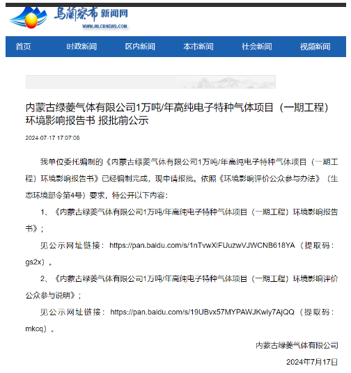 根據烏蘭察布新聞網消息,7月17日,內蒙古綠菱氣體有限公司1萬噸/年高(gāo)純電子特(tè)種氣體項目(一期(qī)工程)環境影響報告書報(bào)批前公(gōng)示。一期(qī)工程總投資36000萬元,建設(shè)規模為4500噸/年三氟化氮生產裝置。