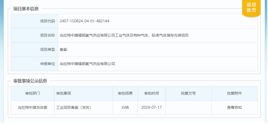 7月17日,烏拉特中旗福順氧氣供應有限公司工業氣體及(jí)特種氣體、標準(zhǔn)氣體儲(chǔ)存充裝項目獲備案。項目建設氧(yǎng)、氮、氬、二氧化碳、混合氣、七氟丙烷、消防氣、標準氣,(氣態、混合態(tài)、液態)充裝線各一套、50立方米的氧(yǎng)、氮、氬、二氧化碳低溫儲槽各一(yī)個,50立方米丙烷儲槽4個,30立(lì)方米七氟丙烷(wán)消防氣低溫(wēn)儲槽2個。甲類庫房儲(chǔ)存有:甲烷、氫(qīng)氣、一(yī)氧化碳,乙烷、乙(yǐ)烯、丙烯(xī)、異丁烷、乙炔(quē)氣、電石。