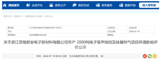 7月19日,浙江亞格新安電子新材料有限公司年產2000噸電子級甲矽烷(wán)及矽基特氣項目環境影響評(píng)價公示。項目主要建(jiàn)設甲(jiǎ)矽烷、氯矽烷歧化反應和提純裝置,最終形成電子級甲(jiǎ)矽烷(wán)2000噸/年、高純級二氯矽烷1000噸/年、高純級四(sì)氯化矽5000噸/年、工業級四氯化矽29230噸/年、工業三氯矽烷 3920t/年的生產能(néng)力。