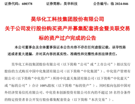 7月22日,昊華科技發布公告稱,截至公告日,中化集團持有的中化藍天52.81%股權及中(zhōng)化資產持有的中化藍天47.19%股權已全部過戶(hù)登記至其名下,此次交易涉及的標的資產交割過戶手續已辦理完畢,其已合法取得(dé)標的資產,中化藍天成為昊華科技全資子公司。