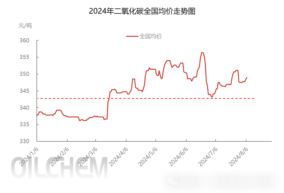 據隆眾統計,截止(zhǐ)8月(yuè)6日,二(èr)氧化碳均價在349元/噸,環(huán)比(7月6日)上漲0.89%,同比-18.27%。數據顯示,二氧化碳價(jià)格不及(jí)去年同期(qī)價格(gé),主要受(shòu)二氧化碳產能過剩影響(xiǎng),供需矛盾突出,價格難以回(huí)到同期價格。雖然往年二氧化碳市場有明顯的淡旺季(jì)之分,但今年來看,二氧化碳淡旺季不明顯。現階段旺(wàng)季不旺特點顯著(zhe)。圖中可以看出市場震蕩調整為(wéi)主。