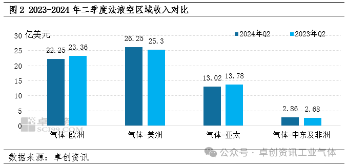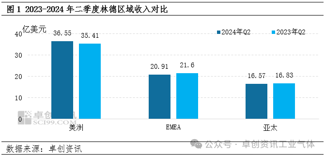 林德(dé)二季度(dù)的營業收入為82.67億美元(yuán),同比增0.77%。與(yǔ)去年相比,由於價格上漲,基礎銷售額增長了3%,而銷量增長持平。上半(bàn)年林德共實現收入163.67億美元,同比基本持平;上半年淨利潤為32.9億美(měi)元,同比增(zēng)長6.4%。法液空二季度(dù)總(zǒng)收入為67.29億歐元,同比下降1.2%,可比基礎上增(zēng)長3.1%,主要受能(néng)源成本及匯(huì)率等影響。分區域來看,美洲地區表現良好,歐洲工業整體需求較為(wéi)疲(pí)軟(ruǎn),亞洲亦顯弱勢。從業(yè)務線來看,大(dà)工業領域收入同比下降7.4%,通用工業和電子領域同(tóng)比變化不大,醫療健康領(lǐng)域同比增長5%。上半年營業收入實現133.79億歐元,同比下降4.3%;淨利潤(rùn)為16.81,同比下降2.4%空氣化工第三財季總收入29.86億美元,同比下降(jiàng)1.58%,原因是不利(lì)的匯率因素占(zhàn)2%,能源成本傳遞降低了1%,抵消了價格上(shàng)漲帶來的1%的增長。前三財季共收入89.13億美元,同比下降(jiàng)5.3%,淨利潤為19.11億美元,同比(bǐ)增長16.2%。林德:美洲的銷售額為(wéi)36.55億美(měi)元,同比增長3.2%。與2023年第二季度相比,主要是價格上漲了4%,銷量基(jī)本持平;亞太地區的銷(xiāo)售額(é)為16.57億美元,同(tóng)比下降1.5%,銷量和價格同比基本持平,主要受匯率波動影響;歐洲、中東和非洲的銷售額為(wéi)20.91億美元,同比下降3.2%,主要是由於價格上漲了3%,但受(shòu)金屬等終端影響,銷量下降抵消了1%的增(zēng)長。法液空:從各(gè)區域氣體服務收(shōu)入來看,歐(ōu)洲地區(qū)收入為22.25億歐元,同比下降4.8%,大(dà)工(gōng)業方麵氫氣在(zài)鋼鐵、化工等終端應用領域的(de)銷量提升。美洲地區收入為26.25億(yì)歐元,同比增長3.8%,該區域各產(chǎn)品線都在增長,大工業領域主要得益於穩定的需求,實現同比增長,通用(yòng)工業領域主要受價格支撐,醫療保健行業受美國和拉丁(dīng)美(měi)洲的(de)家庭保健業務等支撐,營收較一季度的同比增速繼續擴大;此外,電子行業因載氣、設備(bèi)等的銷售,亦實現同比增長。亞(yà)太地區收入為13.02億歐元,同(tóng)比下降5.5%,其中大工業受(shòu)中(zhōng)國地區需求減弱影響明顯,通(tōng)用(yòng)工業則(zé)受氦氣銷量下降影響,電子行業主要受設(shè)備、裝置(zhì)等銷(xiāo)售下降影響。中東及非洲地區收入為2.86億歐元(yuán),同比增長6.7%,各業務線均實現正增長。空氣化工:從各區(qū)域氣體服(fú)務收入來看,美洲地區第三(sān)財季實現收入為12.34億美(měi)元(yuán),同比下降2%,主要是能源成本導致下降了3%,銷量下降(jiàng)了1%,以及1%的不利匯率,而3%的價(jià)格上漲(zhǎng)抵消了部分匯率的波動;亞洲地區收入為7.89億美元,同比下降4%,主要受終端需求減少影響,銷量有所下降,此外匯率(lǜ)波動亦帶(dài)來(lái)不利影響。歐洲的銷售收入為6.93億(yì)美元,同比下降2%,因為能(néng)源成本傳(chuán)導(dǎo)下降(jiàng)了2%,1%的不利匯(huì)率被1%的銷量增長部分抵消。中東(dōng)及印度地區收入為0.33億美元,同比下降17.5%,主要受成本增(zēng)加所致。3.下一季(jì)度各企業利潤均存增長預(yù)期展望下一季度,雖然外部環境(jìng)挑戰重重,但各公(gōng)司在收益增長方麵仍信心滿滿。林德表示,2024年調(diào)整(zhěng)後的每股收益在將在15.4美元-15.6美元,較去年同期增長8%-10%,三季度預計每股收益在(zài)3.82美元-3.92美元,同比增(zēng)長5%-8%;法液空表示2024年,有信心進一步提高營業利潤(rùn)率,並在恒定匯率下實現淨利潤增(zēng)長;空氣產品公司預期2024財年全年調整(zhěng)後每股收益指引為(wéi)12.2美元-12.5美(měi)元,較之前增長(zhǎng)6%-9%,對於2024財年第四財季(jì),空氣產品公司調後的每股收益指引為3.33美元(yuán)-3.63美元。