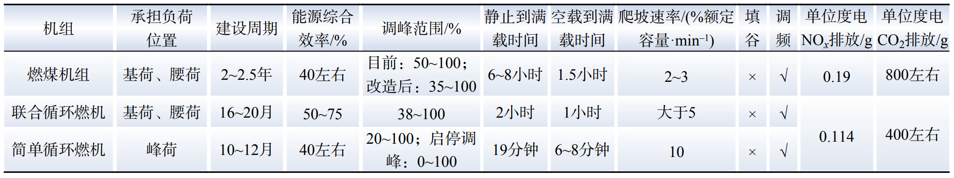 表1  煤電(diàn)、氣電特性對比