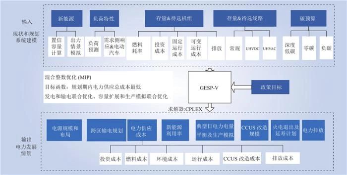 考(kǎo)慮“雙(shuāng)碳”目標下行業間碳減排路徑的統籌優化和頂層設計仍不清晰,電(diàn)力係統應承擔(dān)的具體減排責任和(hé)貢獻潛力尚不明確,以電力行業未來承擔的碳減排實物量為主約束,以2060年電力係統實現零碳排(pái)放為目標,依托碳達峰、碳中和電(diàn)力規劃(huá)軟(ruǎn)件包(GESP-V)優化分析不同情景下電源發展規模布局、傳統電源CCUS改(gǎi)造(zào)捕集規模(mó)和電力碳減排路徑。GESP-V以包含新能源在內的多區域電力規劃模型為核心(xīn),可反映電力電量平衡、碳排放約束、碳(tàn)捕(bǔ)集改造、電(diàn)製氫(qīng)等減碳、新能源(yuán)利用(yòng)等關鍵技術的影響,集成電源規劃、生產(chǎn)模擬、政策分(fèn)析(xī)等係統工具,可針對各(gè)類情景下的能源電力發展路徑、電源發展規模(mó)布局、電力流(liú)向規模、傳統電源CCUS改造捕集規模、電力碳減排路徑等開(kāi)展優化分析,如圖2所示。