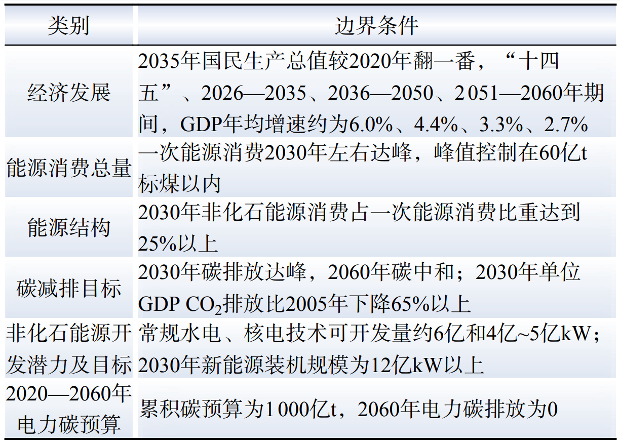 經濟發(fā)展目標、能源需(xū)求、非(fēi)化石能源結構占比、非(fēi)化石能源開發潛力及目標、碳減排關鍵目標和電力碳預算等邊(biān)界條件設置如表2所示。經濟發展、能源消費(fèi)總量、能源結構、碳減排目標作為(wéi)模型中電力(lì)需求預測(cè)外置模塊的輸入邊(biān)界,非化石(shí)能源發電潛力及目(mù)標(biāo)在電源裝機(jī)擴(kuò)展規劃約束中以上限或下限約束(shù)體現,電力碳預算在碳排放約束(shù)方程中(zhōng)體(tǐ)現。