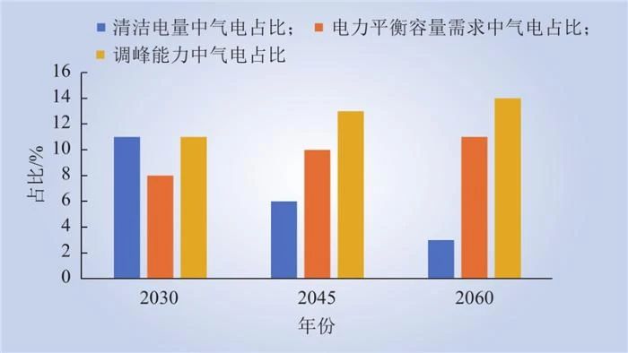 從清潔電量供應看,2030年(nián)前氣電提供清潔電量的(de)功能作用持續增強,2030年(nián)後氣電占清潔電量的比重開始逐步下降,氣電的電量供應(yīng)作用開始減弱。2030年,氣電發電量達到7500億(yì)kW·h,占清潔能源發電量總量的11%。此後隨著氣(qì)電發電利用小(xiǎo)時數的逐步下降,氣電電量增勢放緩,2045年以後氣電發電量開始呈現下降趨勢(shì),氣電占清潔電量的比重(chóng)持續下降,到2060年降至3%左右。