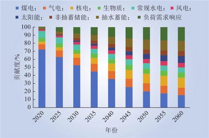 圖6  2020—2060年全國(guó)各類電源電(diàn)力平衡貢獻圖