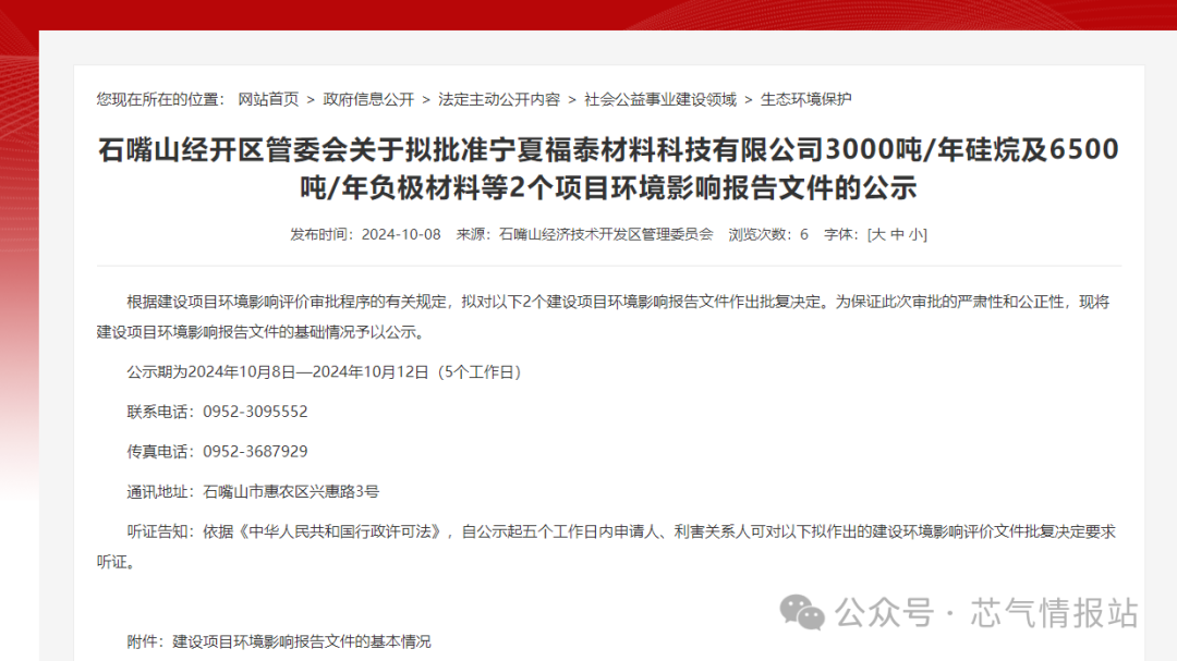 2024年10月8日,寧夏福泰材料科技有(yǒu)限(xiàn)公司3000噸/年矽烷及6500噸(dūn)/年負極材料環境影響報告(gào)文件(jiàn)公示。