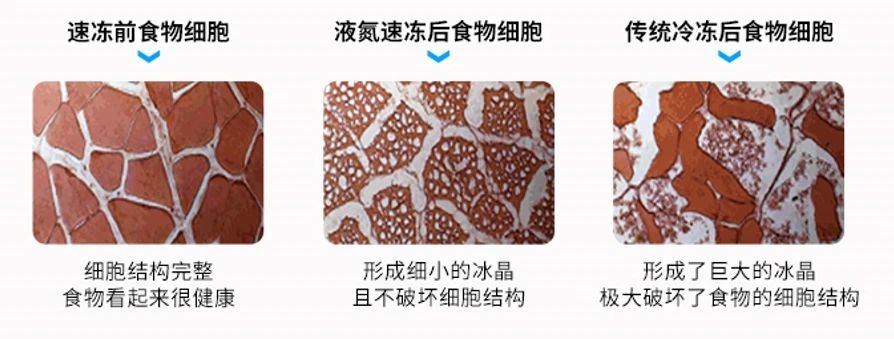 液氮速凍技(jì)術以極低的溫度(-196℃)和(hé)超短的凍(dòng)結時間實現了“極速鎖鮮”。這種技術在不添加防腐(fǔ)劑(jì)的前提下,能夠(gòu)在分(fèn)秒之間迅速凍結食材內部的水(shuǐ)分子,形成微(wēi)小冰晶,保護食材細胞結構(gòu),確保解凍(dòng)後(hòu)保持原有的風味、口感和營養價值。