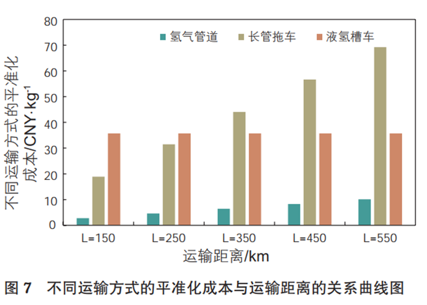 ;當運輸距(jù)離大於350km時,長管拖車的平準化(huà)成本高於液氫槽車。