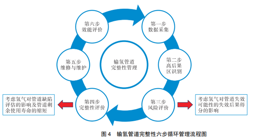 因管道係統完整性管理存在問題而引發的事故占所(suǒ)有事故的50%左右。輸(shū)氫管道更易發生氫致(zhì)失(shī)效與泄漏,泄漏(lòu)後的氫氣具有(yǒu)燃燒速度快、燃燒釋放能量(liàng)高等特點,發生事故後造成的危害極大(dà)。因此,對輸氫管道進行完整性管(guǎn)理(lǐ)是建設輸氫管網的重要環節之一。