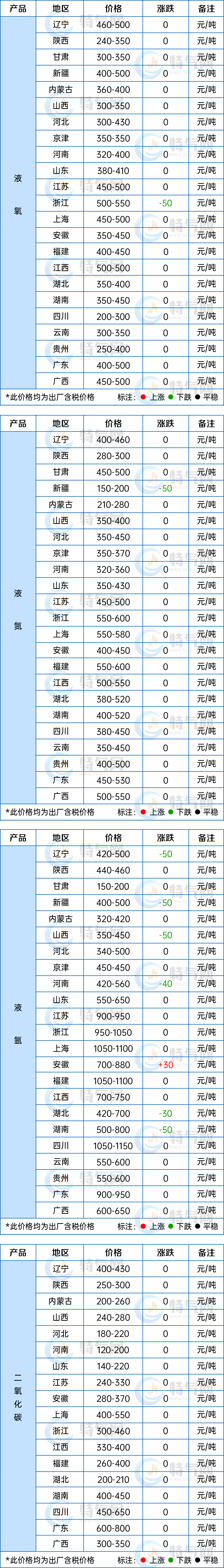 【液氧】今日國(guó)內(nèi)液(yè)氧市場氛(fēn)圍冷清,交投(tóu)欠佳。華北地區下遊鋼廠限產對液氧需求不高,氣(qì)體廠家出貨不暢價格低位(wèi)盤整;華東液氧市場氛圍一般,氣體廠家出貨為主,價格小幅調整;西(xī)南地區弱勢維穩(wěn),下遊按需采購,成交清淡(dàn)。【液氮】液氮市場行情下滑,局部價格震蕩調整。西北地(dì)區(qū)需求低迷,液氮廠家降價出(chū)貨為主,下遊按需(xū)采購,成交一般(bān);華東液氮市場持穩運行,終端需求不佳,對液氮市場價格支撐有限,價格平穩。【液氬】液氬市場(chǎng)整體(tǐ)走勢欠(qiàn)佳,價格下行為主。華中地區貨源供應正常,下遊需求企業(yè)采購力度(dù)不大,氣體廠家庫存承壓,價(jià)格繼續下滑;華東(dōng)液氬市場大穩小動,安徽局部地區成(chéng)交(jiāo)尚可,價格窄幅上調;華南(nán)地區氛圍一般,成交偏淡。【二氧化碳】二氧化碳市場交投平淡。河北、河南主力企業液位尚可,需求市場表(biǎo)現穩定,市場交投變化不大,價格暫穩;華東二氧化碳(tàn)市場暫穩運行,整體波動不大,市場成交一般,價格(gé)暫無明顯調整。