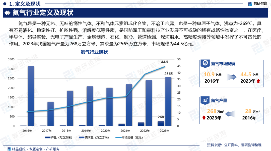 氦氣是是一種無(wú)色、無味(wèi)的惰性氣體,不和(hé)氣體元素組成化(huà)合物(wù),不溶於金屬,也是一種(zhǒng)單(dān)原子氣(qì)體,沸點為-269℃。具有不易液(yè)化、穩定性好、擴散性強、溶解度低等性質(zhì),是(shì)國防軍工和高科技產業發展不可或缺的稀有戰略(luè)性物資(zī)之一,在醫療、半(bàn)導體、超導實驗、光(guāng)電子產品生產、金屬製造、石化、製(zhì)冷、管道檢漏、深海(hǎi)潛水、高精度焊接等領域中(zhōng)發揮了不(bú)可替代的(de)作(zuò)用。2023年我國氦氣產量為268萬立方米(mǐ),需求量為2565萬立方米,市場規模為44.5億元。