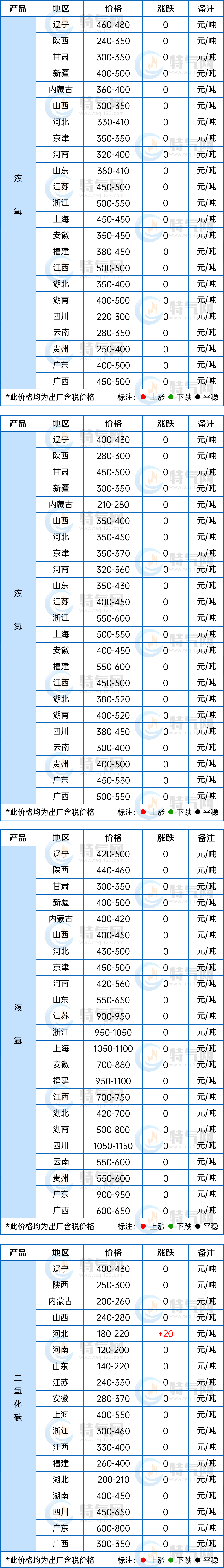 【液氧】今日國內液氧市場行情平穩,價格暫無調整。北方地區空分裝置運行平穩,氣體(tǐ)廠家庫存充足,終端需求持續低迷,市場成交不(bú)多;華東液氧市場氛圍欠佳,下遊需求暫無明顯(xiǎn)變化,西南地區暫穩運行,供需兩端暫無(wú)明顯變化,價格弱勢維穩。【液氮】液氮市場走勢一般,成交平平。華北地區貨源供應充足,下遊企業采購有限,市場成交寥寥;華東液氮(dàn)行情延續穩勢(shì),氣體廠家出貨為主,液氮市場供貨相對平穩;華南地區(qū)下遊需求清淡,價格暫穩為主。【液氬】液氬市場氛圍冷清,價格震蕩調整。華中地區液氬(yà)市場氛圍欠佳,受(shòu)周邊地區跌勢影響,場內(nèi)成交轉淡,價格持續下滑(huá);華東液氬市場表現一般,價格(gé)暫穩(wěn)運行;華南地區持穩為主,終端需求(qiú)暫無明顯提升,液氬(yà)價格暫無調(diào)整。【二氧化碳】二氧化碳市場交投(tóu)穩定,價格大穩小動。河北(běi)地區二氧化碳供應尚可,下遊需求企業采購穩定,部分低價窄幅(fú)上調;華東二氧化碳市場持穩為主,整體波動不大,市場成交一(yī)般。