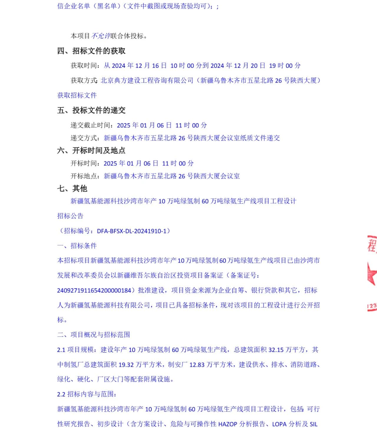 12月16日,新疆氫基能源(yuán)科技沙灣市年產10萬(wàn)噸綠氫製60萬噸綠氨生產線項目發布工程設(shè)計招標公告。據悉,該項目(mù)資金來源為自籌資金395783萬元(yuán)。招標人為新疆氫基能源科技有(yǒu)限(xiàn)公(gōng)司。該項目計劃建設年產10萬噸綠氫製(zhì)60萬噸綠氨(ān)生產線,總建築麵(miàn)積32.15萬平方,其中製氫廠總建築麵積19.32萬平方米,製安廠12.83萬平(píng)方米,建設供水、排水(shuǐ)、消防(fáng)道路、綠化、硬化、廠(chǎng)區大門等配套附屬設施。招標範圍包括可行性研究報告(gào)、初步設計(含方案設計、危險與可操作性HAZOP分析報告、LOPA分析及SIL定級報告、安全設(shè)施設計專篇、職業病防(fáng)護設施設計專篇(piān))、施工圖設計及其他相關服務(wù)。