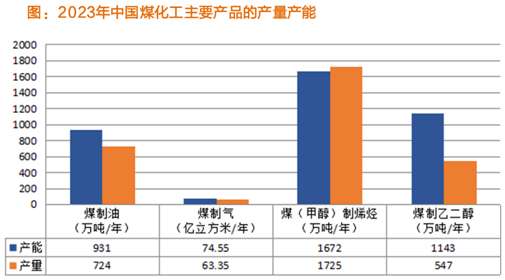 2023年,煤製油、煤製氣、煤(甲醇)製烯烴、煤製乙二醇產能分別達(dá)到 931萬噸/年、74.55億(yì)立方米/年(nián)、1672萬噸/年、1143萬噸 /年,產(chǎn)量分別(bié)為724萬噸/年、63.35億立方米/年、1725萬噸(dūn)/年、547萬噸/年。