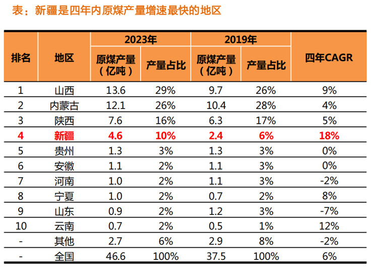 新疆煤炭資源總量約(yuē)2.19萬億噸,占(zhàn)全國煤炭(tàn)資源總量的40.6%,資源量位居全國第一。雖然新(xīn)疆的原煤產量(liàng)在2019-2023年四年間的CAGR為18%,遠高於全國CAGR的6%,煤炭開采加速發展,但2023年產量僅占全國的10%,仍有較大提升空間。坐擁優質煤炭資源,新疆(jiāng)煤化工產業得到快速發展,尤其是國家提出“三基地一通道”建設,明確定位新疆建設國家大型煤炭煤(méi)電(diàn)煤化工基地後,煤化工項目投資力度加(jiā)大。