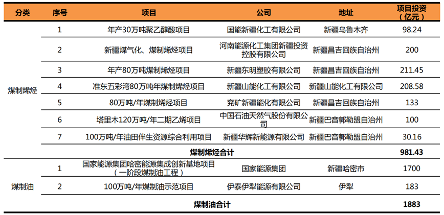 煤製(zhì)油與煤製烯(xī)烴:分別投(tóu)資1883億元、981億元,合計投資近3000億。