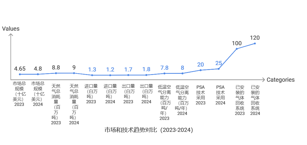 • 2024年,低溫空氣分離裝置(ASU)的產能增長了3.2%,新建了約12座低溫空分設備(bèi),總產能達(dá)到約800萬噸/年(nián)。