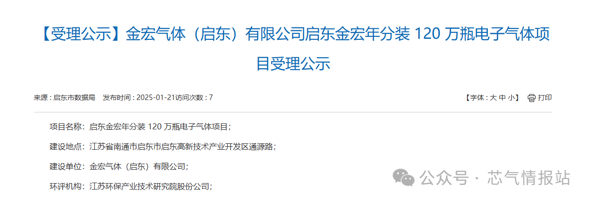 1月21日,金宏氣體(啟東)有限公司啟(qǐ)東金宏年分裝120萬(wàn)瓶電子氣體項目環境影響報(bào)告表(biǎo)受理公示。