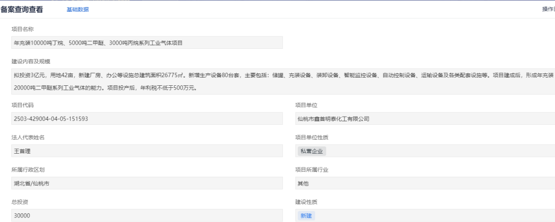 3月26日,仙桃市鑫首明泰化工有限公司申報了年充裝10000噸丁烷、5000噸二甲醚、3000噸丙烷係列工業氣體項目的備案信息。