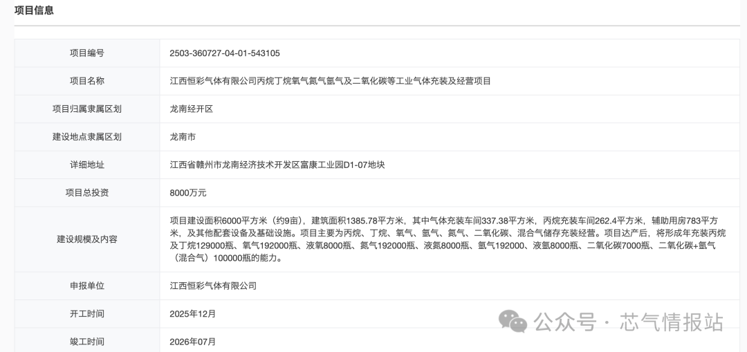 資料顯示,該項目位於江西省贛州市龍南經濟(jì)技術開發區富康工業園(yuán)D1-07地塊,申報單位為江西恒彩氣體有限公司,項目總投資8000萬元。