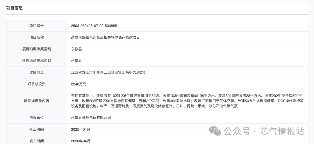 該項目位於江西省九江市永(yǒng)修縣雲山企業集團榮(róng)祺(qí)大(dà)道2號(hào),申報單位為永修縣(xiàn)誠翔氣體有限公司,項目(mù)總投資2240萬元。