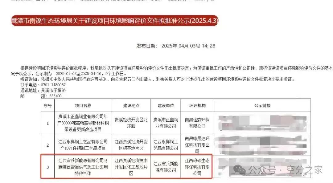 2025年4月3日,鷹潭市貴溪生態環境局擬對江西宏兵(bīng)新能源有限公司製氧裝置管道供氣及工業醫用特種氣體項目環境影響評價文件作出批複決定,並對(duì)該項目基本情況進行公示。