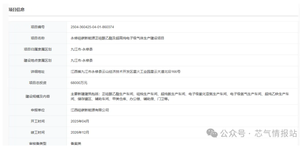 4月25日,永修(xiū)矽碳新能源正矽酸乙酯及超高純電子級氣體生產建設項目申請備案。