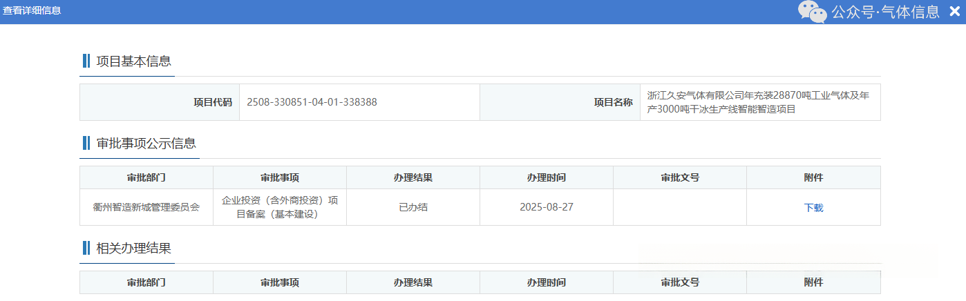 8月27日,浙(zhè)江久安氣體有限公司年充裝28870噸工業氣體及(jí)年產3000噸幹冰生產線智能智造項目獲備案(àn)。