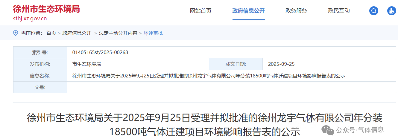 9月25日,徐州龍宇氣體有限公司(sī)年分裝18500噸氣體遷建項目環境影(yǐng)響報告表受理(lǐ)公示。