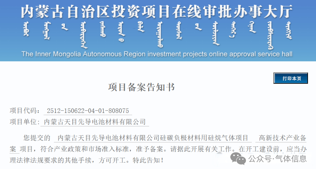 12月30日,內蒙古自治區投資項目在線審(shěn)批辦事大廳發布內蒙古天目先導電池材料有限公司矽碳負極材料用矽烷氣體項目備案審批公示。