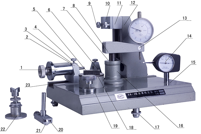 1.示值定位裝置 2.測微頭座 3.固定螺紗 4.測杆 5.偏心鎖緊軸 6.百分表座 7.升降軸固緊螺釘 8.旋臂 9.V型壓板固緊(jǐn)螺(luó)釘 10.V型壓板 11.V型夾座 12.立柱 13.旋臂固緊螺釘 14.指針式扭簧測力(lì)計 15.底座 16.升降立柱 17.水平腳 18.帶筋平台(tái) 19.升降調節螺釘 20.固緊螺釘(dìng) 21.杠杆百分表夾具 22.V型托架 23.半圓柱形(xíng)側塊