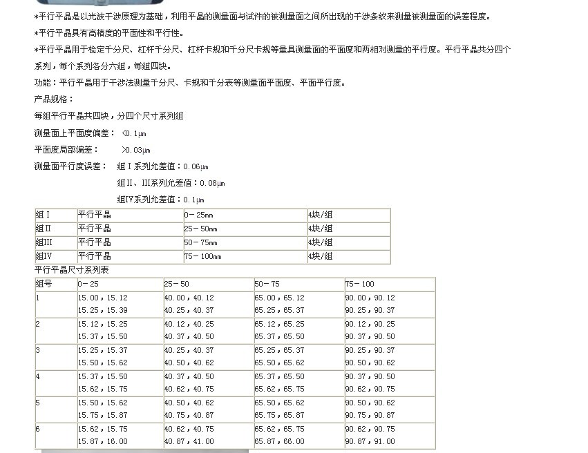 平麵(miàn)平晶(jīng) 具體規格有Ф30mm;Ф45mm;Ф60mm;Ф80mm;Ф100mm;Ф150mm;Ф200mm;Ф250mm;Ф300mm共計九款。