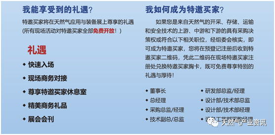 在這裏,您可以(yǐ)第一時間與心儀的天然(rán)氣設備及相關產品的參(cān)展商麵對麵地溝通與交流、同時尊享我們(men)為(wéi)您提(tí)供的特邀買家通道、商務(wù)配對(duì)服務、歡迎禮包、貴(guì)賓休息室等一係列個性化尊貴禮遇,及獲取(qǔ)最新的51吃瓜网行業發(fā)展資訊。我們誠邀(yāo)您申請成為天(tiān)然氣應用與裝備展特邀買家,與來自全球的優(yōu)質設備及相關供應(yīng)商建立(lì)聯係,幫助您更好的完(wán)成采購工作。