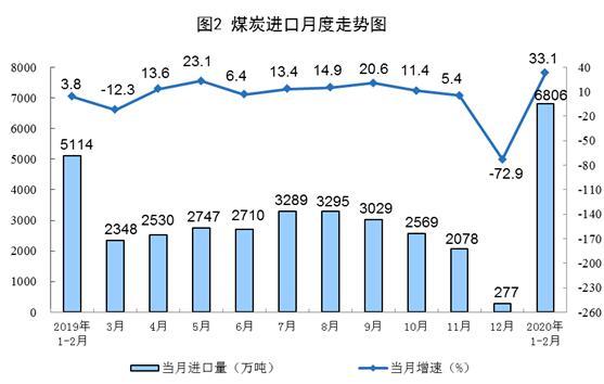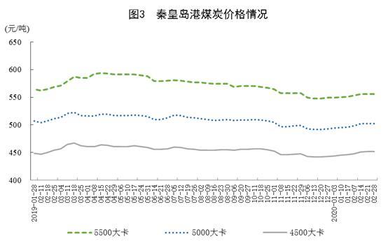 原煤生產(chǎn)下降。1—2月份,生產原煤4.9億噸,日均產量815萬噸,同比下降6.3%;進口煤炭6806萬噸,同比增長33.1%。港口煤炭綜合交易價格有所(suǒ)上漲(zhǎng),2月28日秦皇(huáng)島港5500、5000和4500大卡煤炭價格分別為每噸556元、502元和452元,比1月3日分別上(shàng)漲7元、8元和8元。