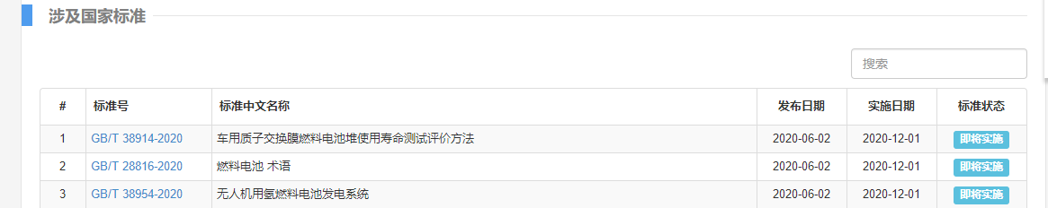 其中,在燃料電池領域,有3個相關的標準位列其(qí)中,它們分別是GB/T 38954-2020 無人機用氫燃料電池發電係(xì)統(tǒng);GB/T 38914-2020 車用質子交換膜燃料電(diàn)池堆使用壽命測試評價方法;GB/T 28816-2020燃料電池術語等3個標準。